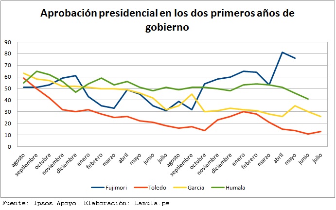 Si observamos los dos primeros años de gobierno de los últimos cuatro presidentes electos democráticamente, Humala ha logrado superar la clásica “luna de miel” y mantenerse, en promedio, en un52% en su aprobación. Sin embargo, los últimos resultados podrían suponer una caída significativa, aún cuando se mantenga por encima del promedio de aprobación de otros presidentes.